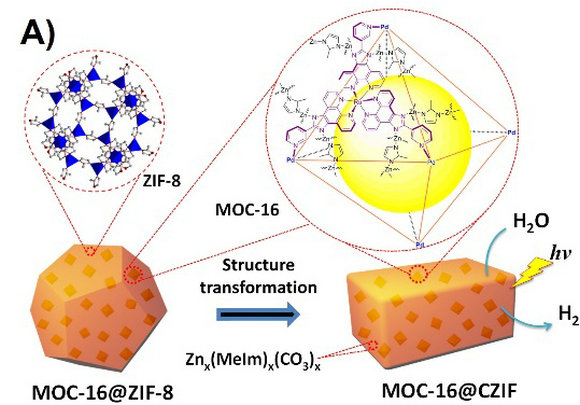 最近,我校化学学院苏成勇教授和石建英副教授研究团队又基于配位组装策略实现了Au25(SG)18纳米簇在金属有机ZIF-8主体框架内部和外表面的可控组装[Advanced Materials, 2018, 30,1704576]。采用相似策略,他们将MOC-16植入到ZIF-8主体内,进一步将ZIF-8转化为Znx(MeIm)x(CO3)x (CZIF),获得了MOC-16@CZIF催化剂。