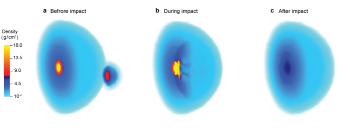 具有原初致密核的木星与一个十倍地球质量的行星胚胎发生碰撞,结果导致稀释核