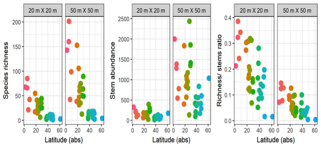 近日,我校生命科学学院储诚进教授课题组在生态学领域顶级期刊Ecology Letters(IF5 = 11.775)上发表了题为“Direct and indirect effects of climate on richness drive the latitudinal diversity gradient in forest trees”的学术论文。该项研究基于全球35个大型固定森林样地(CTFS-ForestGEO)的调查数据(样地分布于25.10° S—61.30° N之间,面积从9公顷至60公顷不等),系统地研究了气候和森林林分特征对树木纬度多样性梯度格局的影响。储诚进教授为该论文的唯一第一作者和唯一通讯作者,我校生命科学学院为唯一作者单位。该项工作联合了国际上48个科研院所的73位科研人员,得到了国家重点研发计划和国家自然科学基金等项目的资助。