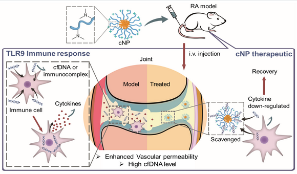 类风湿性关节炎(Rheumatoid Arthritis, RA)是一种常见的慢性自身免疫疾病,其发病率约占世界人口的1%。自身抗原激起免疫系统释放的细胞因子侵蚀关节骨和软骨,导致骨变形、关节肿胀,严重影响患者生活和工作。目前其临床治疗主要是采用包括甲氨喋呤等抗风湿药物(DMARD)和抗TNF-?抗体等抗体类生物药物,但存在毒副作用、影响免疫系统、价格昂贵等严重问题,因此寻求新的治疗RA策略依然是重大挑战。近年的研究表明,患者关节积液中的cfDNA浓度异常高,而游离核酸又可被免疫细胞的TLR样受体识别,产生非正常的免疫反应。