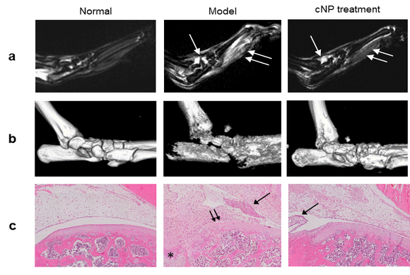 cNP治疗后大鼠模型的软组织(a. 后掌MRI影像)、骨质量(b. 踝关节microCT影像)和炎症浸润改善(c. HE染色)的结果