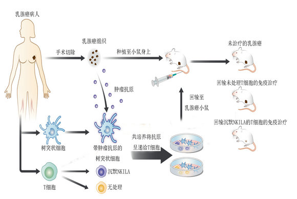 研究团队在体外对T细胞进行了修饰,沉默了NKILA的表达,再将T细胞回输至患了乳腺癌的小鼠模型体内,NF-κB通路便会维持在激活状态。他们发现,如此一来肿瘤内的T细胞明显增多,被杀伤的肿瘤细胞增多,肿瘤明显缩小。