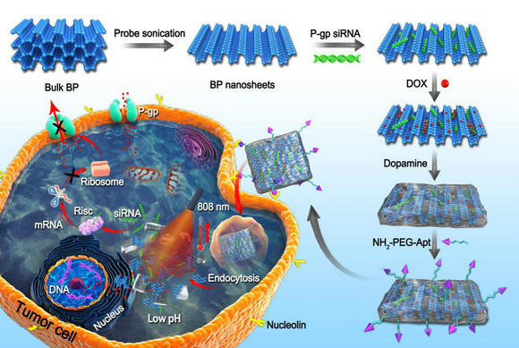 为了解决黑磷在药物载体系统的上述局限,梅林教授课题组设计了一种简易高效的方法。该项工作在黑磷表面包裹一层仿生的聚多巴胺膜(Polydopamine, PDA),形成一种“纳米胶囊”结构。聚多巴胺具有良好的生物相容性,可以有效隔离氧气或水与黑磷纳米片的接触,从而提高其稳定性。此外,聚多巴胺自身具有良好的光热效应,因此聚多巴胺的包覆可以进一步增强黑磷药物载体系统的光热效应。在此基础上,科研人员将小干扰RNA(siRNA)和广谱性抗癌药物多柔比星(DOX)负载到了“纳米胶囊”内部,并在聚多巴胺表面修饰上了靶向基团核酸适配体(Aptamer, Apt),制备了一种集化疗、基因治疗和光热治疗于一体的多功能靶向纳米载药平台。目前,该研究在动物体内实验上取得突破,并在乳腺癌模型的裸鼠身上取得了良好的肿瘤治疗效果。
