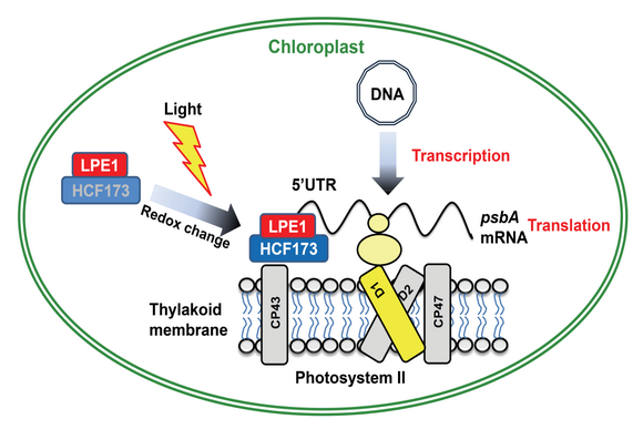 通过系统筛查,研究人员鉴定到一个高等植物特有的PSII生物发生调控因子——LPE1(LOW PHOTOSYNTHETIC EFFICIENCY 1)。通过生理学、分子生物学、生物化学和遗传学等手段研究发现,LPE1基因突变导致PSII活性剧烈降低,PSII生物发生严重受阻;同时光PSII核心蛋白D1的合成明显受损。值得注意的是,LPE1编码一个叶绿体PPR蛋白,直接与D1编码基因psbA mRNA的5'UTR结合,从而招募核糖体并启动D1蛋白的翻译。更重要的是,LPE1同时与已知的D1翻译因子HCF173(HIGH CHLOROPHYLL FLUORESCENCE 173)互作,促使HCF173与psbA mRNA结合,协同参与调控PSII生物发生。