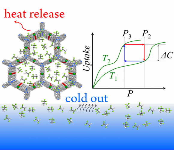 近期,我校化学学院张杰鹏教授研究团队设计了一类具有蜂窝状一维孔道的新型三维框架。由于使用了二次对称的金属草酸根链和三次对称的有机桥联配体,其孔道直径大约是配体桥联长度的四倍。因此,使用三种普通的三角形有机配体,就合成了孔径约为2-4 nm的三例新型介孔框架MCF-61、MCF-62和MCF-63,其孔容为1.19-2.36 cm3g-1,BET表面积为2096-2749 m2g-1。以温室效应可忽略的R-134a(1,1,1,2-Tetrafluoroethane)作为吸附质时,这些材料体现出介孔材料的IV型吸附等温线,而且吸附量突跃的压力随孔径增大而增大。在日常所需的吸附制冷或热泵以及常见的低温热源温度下,MCF-63可实现高达1.19 g g-1或0.38 g cm-3的循环工作量,远高于具有相似孔容和表面积,但孔径分布不均且具有I型吸附等温线的多孔碳材料。上述结果不但为PCP/MOF提供了一种新的框架模型,还展示了介孔材料在吸附热转换应用的潜力。相关工作发表Advanced Materials(DOI:10.1002/adma.201704350)上,并获Materials Views China报道。本文第一作者为jinnianhui今年会化学学院2016级硕博连读生莫宗文。