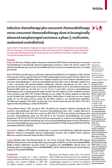 为此,我们团队牵头全国10家3甲医院,历时8年共同完成了一项前瞻性多中心III期随机对照临床试验,将入组患者随机分入TPF诱导化疗联合同期放化疗组(试验组)或同期放化疗组(对照组),比较两组的生存率及毒副反应。该研究在国际上首次证明诱导化疗能够提高鼻咽癌的疗效且治疗毒性可以耐受,病人的生存率提高了8%,肿瘤转移的发生率降低了7%。研究结果在全球排名第一的肿瘤学杂志《柳叶刀?肿瘤》发表。这是近10年来唯一能够提高局部晚期鼻咽癌生存率,减少肿瘤扩散的3期临床试验,有望在不久的将来被美国和欧洲的指南所采纳,在全世界推广应用。国际同行芝加哥大学医学中心Michael T Spiotto教授发表同期评论,认为此论文为确立鼻咽癌最佳综合治疗模式提供了高级别的循证医学证据,也为诱导化疗在其它头颈肿瘤中的应用提供了新的研究思路。此外,中国《健康报》头版头条以《鼻咽癌治疗我国再度领跑》为题进行报道并发表特约评论:《领跑者更需要全方位支持》,同时该项研究成果得到科技日报、中国医学论坛报、健康报、医师报和广州日报等海内外主流媒体10余次正面报道。