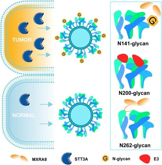 该团队在先前的研究中已经鉴定基质重塑相关蛋白8(matrix remodeling associated 8, MXRA 8)是OVM的受体,并且将MXRA 8设定为指示OVM高效溶瘤的生物标志物之一。然而,考虑到病毒蛋白的翻译后修饰可能会影响病毒与受体的结合,作者进一步对OVM上N-糖基的结构与功能展开了研究,以阐明OVM对肿瘤细胞选择性的机制。