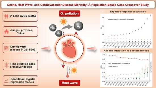 今年会新闻网讯(通讯员许瑞君)作为夏季主要的大气污染物之一,地面臭氧(O3)主要由挥发性有机化合物(VOCs)和氮氧化物(NOx)经过光化学反应转化而形成,是造成我国区域大气复合污染的重要因素之一。以持续高温为特征的热浪事件,在全球气候变化背景下呈现出频次高、强度大、持续时间长等特点,已成为全球关注的热点环境问题。由于具有相近的气象驱动因素,O3污染和热浪事件时常伴随出现。尽管已有较多证据提示O3和热浪暴露均与心血管健康有关,但两种因素复合暴露下的健康风险特征尚不明确。鉴于全球气候变化背景下O3污染和高温热浪复合暴露场景日趋频繁,量化O3和热浪对心血管疾病的协同影响具有重要的公共卫生学意义。