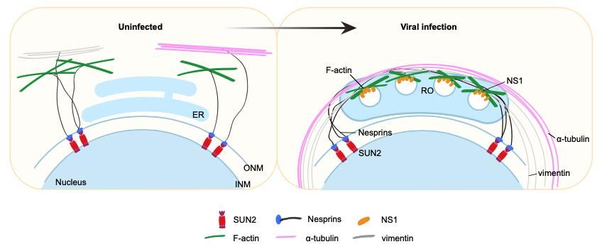 SUN2位于细胞内核膜,它是如何“遥控”细胞质骨架运动的呢?研究人员推测:SUN2可能通过与之相连的外核膜蛋白(Nesprins)传递机械力,来指导细胞质骨架的运动。免疫共沉淀实验表明SUN2、Nesprin、actin和NS1的确存在互作;在病毒感染后,外核膜蛋白Nesprins以SUN2依赖的方式向核周聚拢。当破坏Nesprins结构完整性后,NS1与actin的互作减弱,表明SUN2与Nesprins共同介导了NS1-actin诱导的复制囊泡的形成。此外,Nesprins的负显性表达,与SUN2敲除一样,显著下调病毒的复制水平。