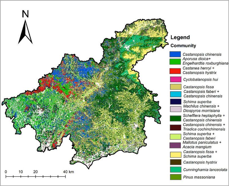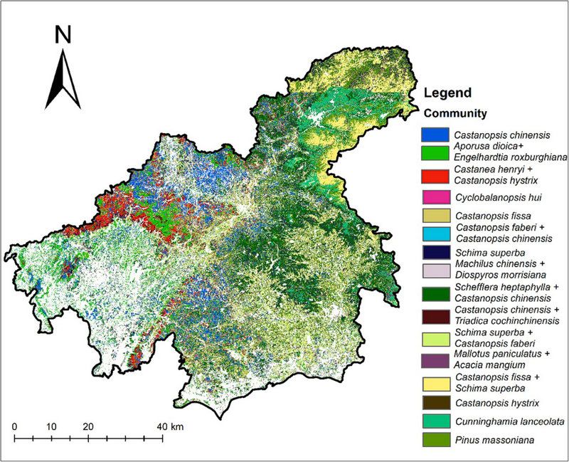 森林是地球陆地上最主要的自然生态系统类型。森林覆被格局的现状是历史过程的结果。受自然和人为因素的影响,区域性的森林景观及结构总是处于不断变化的动态过程。无论是在全球性还是区域性的范围内,森林覆被的变化与环境变化之间都存在着复杂的非线性动态反馈关系。因此,重建历史森林景观的格局,建立长时间序列的森林景观图谱,对于研究森林对生态环境的影响及其对气候的响应机制具有重要意义。目前国际上大多数重构研究采用的算法较为简单,获取的空间分布信息分辨率不高,精度验证结果不甚理想。针对这一问题,余世孝教授课题组联合了中国林业科学研究院李意德和周璋研究员、中国科学院华南国家植物园曹洪麟研究员以及华南农业大学唐光大教授等课题组,在对广州市北部地区森林植被进行大范围调查的基础上,结合遥感判别和聚类分析方法对该区域的主要森林群落进行划分,基于气象因子、地形因子、与各个土地利用类型的最近距离、回溯起始年份的森林群落空间分布数据等要素,结合AdaBoost算法(用弱分类器的线性组合构造强分类器)改进的人工神经网络(Artificial Neural Network,ANN)和自然林地的分布关系,创建了一个基于元胞自动机(Cellular Automaton,CA)的空间演化模型来重建历史森林的空间格局,使用CA-AdaBoost-ANN对广州市北部地区的2000年和1990年的森林群落进行重建(图1和图2),且与广州市北部地区森林群落的实际分布有很高的吻合度。研究文章所提出的CA-AdaBoost-ANN模型能揭示外部环境和演替内因驱动下的历史森林格局,特别是能在种群和群落水平上重建历史时期的森林景观图谱。研究结果可为森林经营管理提供理论依据,也为预测未来森林格局演变提供了有效手段。