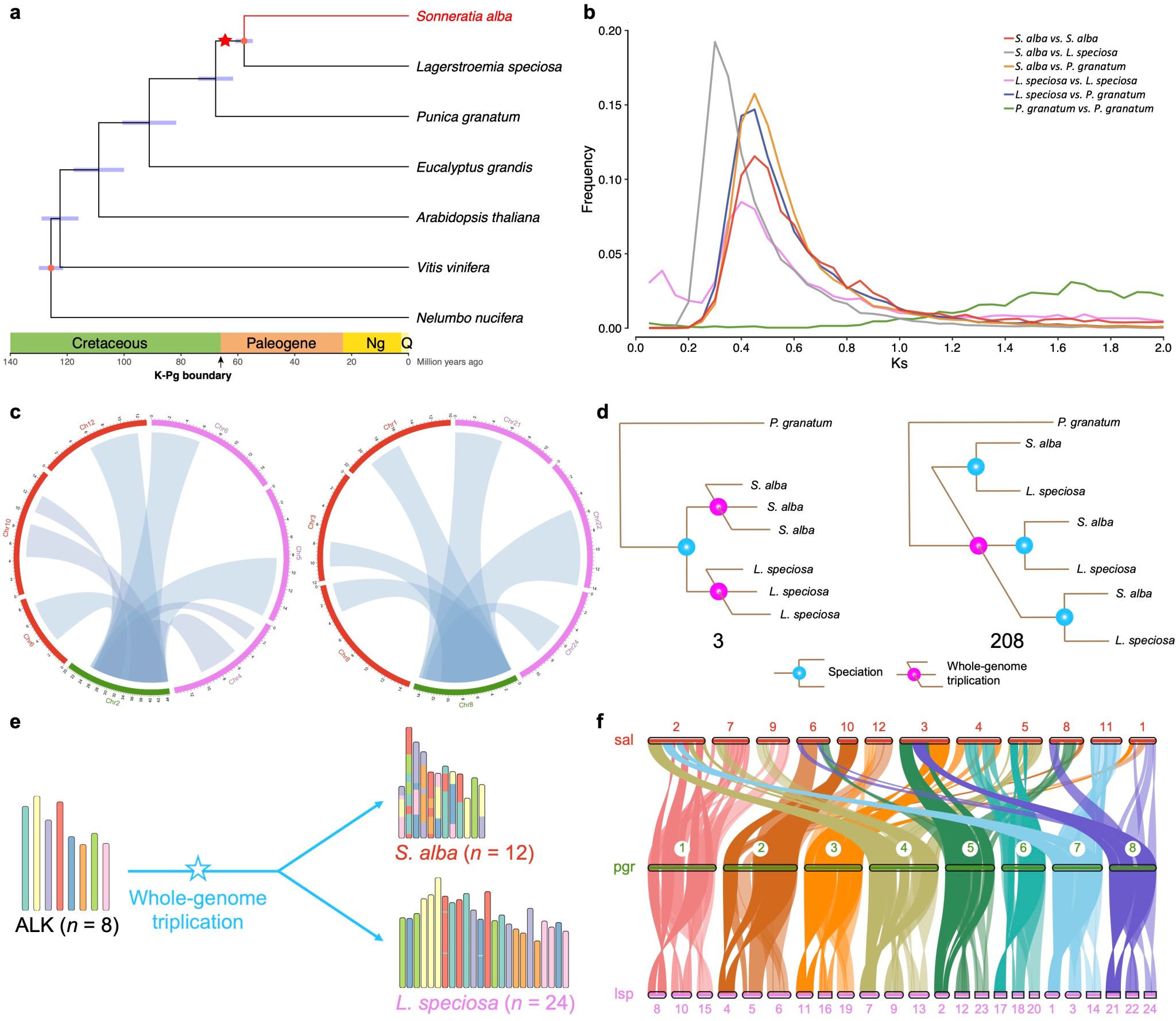 图1 杯萼海桑和大叶紫薇的共同祖先经历的全基因组三倍化-重二倍化事件。(a)杯萼海桑和大叶紫薇的共同祖先在距今六千四百万年前经历了多倍化事件;(b-d)全基因组三倍化的基因组学证据:非同义突变率分布、基因组共线性区域和系统发育分析结果;(e-f)多倍化后染色体水平演化和重排介导的重二倍化基因组学证据。