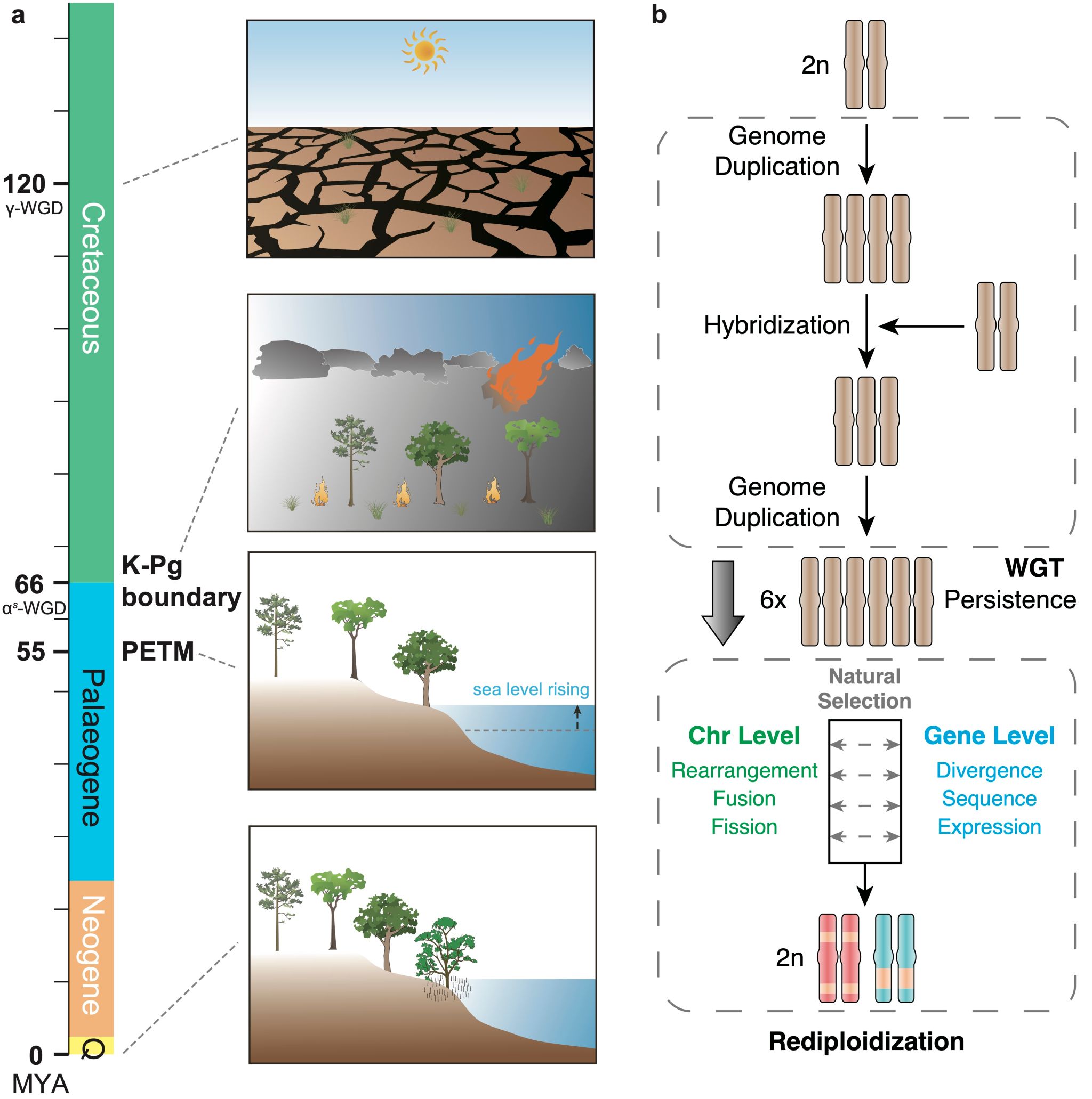 考虑到倍性变化在基因组进化中的潜在作用,研究人员结合新发现的基因组学证据,进一步提出了一个关于多倍化-重二倍化过程的框架模型,用以阐明植物在全球气候环境剧变和恢复期间的适应性进化,通过基因组冗余减少、基因分化和染色体重排等方式,重二倍化能使多倍化后的植物基因组恢复稳定,为之后被子植物类群的生物多样性发展奠定基础。