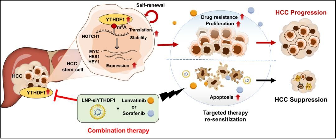 综上,该研究揭示了YTHDF1在调节HCC干性中的重要作用,阐明其通过YTHDF1-m6A-NOTCH1表观转录轴促进HCC干性的新机制,提示YTHDF1有望成为增敏HCC药物治疗的新靶点。这一研究为深入理解HCC靶向治疗耐药机制提供了重要线索,为肝癌药物治疗提供了潜在靶点。