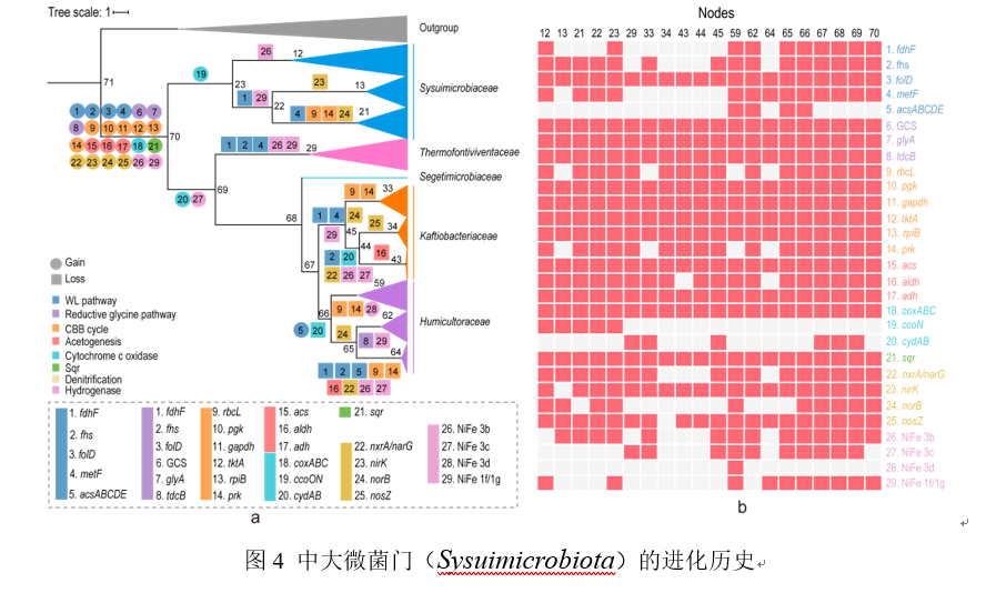 本研究从热泉原始样品的宏基因组数据中重构了CSP1-3类群的基因组,结合NCBI数据库中的基因组,最终选取112条完整度大于80%,污染度小于5%的CSP1-3类群基因组进行分析。系统发育结果显示,这112条基因组所代表的菌株属于同一门,可划分为5个不同的科,11个属和25个种(图1)。这些基因组所代表的菌株广泛分布于世界各地,土壤和热泉是适合该类群生存的生境(图1)。基因组分析结果显示,该门类群的菌株是兼性厌氧微生物,能通过还原性甘氨酸途径(RGP)、卡尔文循环(CBB)和伍德-永达尔通路(WLP)进行碳固定实现自养生长,氢化酶的存在及硫化物的氧化是自养生长过程中主要的能量来源(图2)。采用自养培养基在厌氧条件下对CSP1-3类群进行富集,荧光原位杂交(FISH)实验及扩增子结果显示,CSP1-3类群被成功富集且丰度有明显的提高。同时,宏转录组及稳定同位素核酸探针(DNA-SIP)技术分析结果进一步证实了CSP1-3类群的化能自养功能(图3)。进化分析表明,CSP1-3类群的祖先能通过RGP进行自养生长并产生乙酸,且该功能在该门类群之间进行垂直传递,而CBB、WLP和反硝化功能则是通过不同的水平基因转移事件获得(图4)。最终,本研究将该门类群命名为今年会微菌门(Sysuimicrobiota phy. nov.)。该研究通过多组学技术和富集培养手段,系统深入地探究了今年会微菌门的多样性,空间分布格局,参与的生态功能角色和进化历史,拓展了对未培养细菌的认知,完善了热泉微生物生态功能过程理论,也为极端环境微生物新资源的挖掘提供了一种可能的思路和策略。