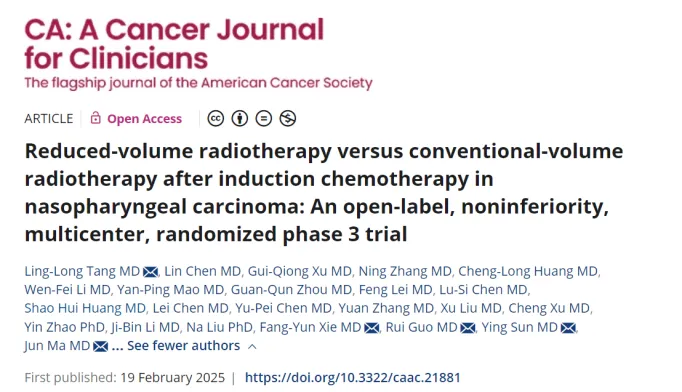 今年会新闻网讯(通讯员赵现廷)2025年2月20日,jinnianhui今年会肿瘤防治中心马骏院士、孙颖教授、唐玲珑教授团队在国际肿瘤学巅峰期刊《临床医师癌症杂志》(CA:A Cancer Journal for Clinicians)(影响因子503.1)发表全球首篇临床试验研究论著。这项突破性成果以“鼻咽癌诱导化疗后缩小体积放疗对比传统放疗”为题,开创了该杂志创刊的先河。