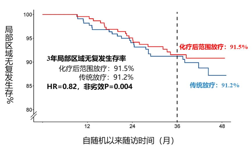 为此,马骏院士团队展开有关研究,采用了国际通用的标准多中心、随机、平行对照设计,纳入445例中晚期鼻咽癌患者,随机分为两组:分别基于化疗后和化疗前肿瘤范围进行放疗。主要终点为3年局部区域无复发生存率,次要终点包括毒副反应和生活质量。