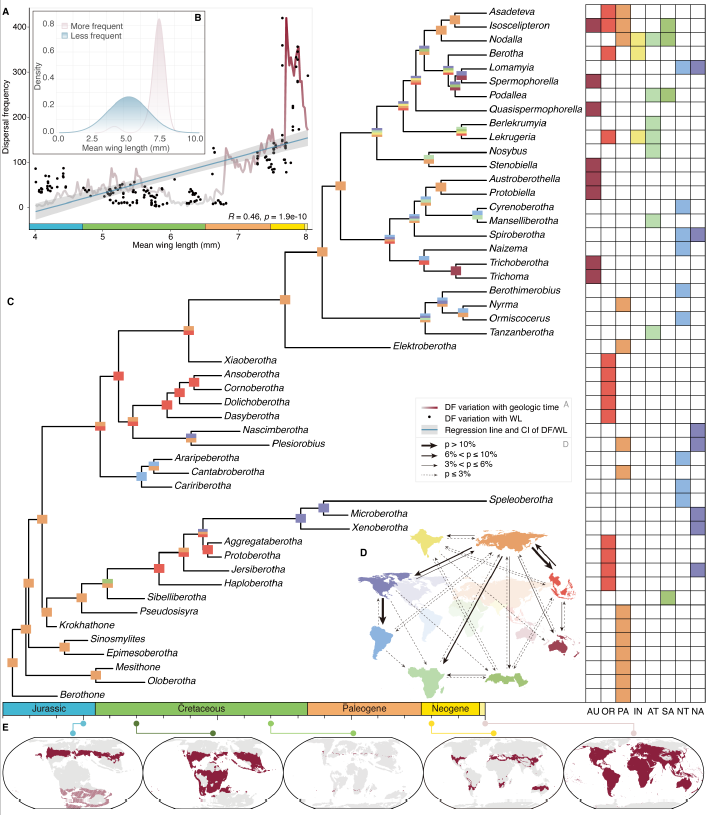 师超凡教授团队综合应用生态位模拟、系统发育分析、计算流体力学与历史生物地理重建等跨学科的理论与方法,揭示了脉翅目鳞蛉科(Berothidae)昆虫的适应性演化、扩散历史及其与地质环境变化的动态互作机制:鳞蛉通过生态位变化和飞行能力优化的双重策略,在1.7亿年间成功实现了对地球环境变迁的响应和地理分布格局的演变,展现了一个古老昆虫类群在地球上长期生存的智慧。