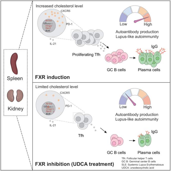 研究发现,FXR在 Tfh 细胞中相对上调。Fxr 缺失可在稳态和Pristine诱导的狼疮模型中显著抑制 Tfh 细胞的扩增,导致生发中心功能障碍、血浆细胞数量减少和自身抗体减少,最终有效减轻pristane诱导的狼疮模型中肾脏、肝脏的狼疮病理学症状。进一步的研究表明,FXR 通过细胞内源性调节 Tfh 细胞的胆固醇稳态,进而控制 Tfh 细胞的增殖。最后,在临床前治疗中,使用FDA批准的药物FXR拮抗剂熊去氧胆酸(UDCA)治疗MRL/LPR狼疮自发模型小鼠,发现其可通过抑制Tfh细胞的扩增、GC反应和自身抗体产生,缓解狼疮病理学症状,这些发现为将 FXR 作为 SLE 的潜在治疗靶点提供了依据。