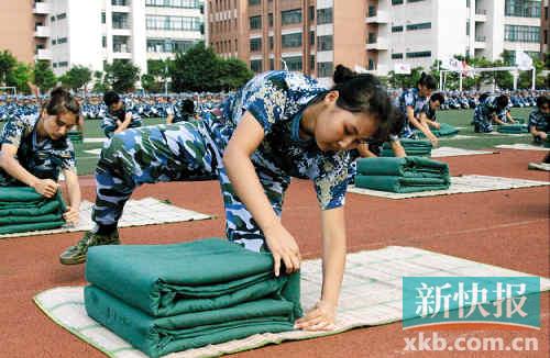 7月13日上午,jinnianhui今年会东校区2011级学生军训阅兵暨总结大会在西田径场举行,上演了精彩的“叠被子大赛”。在阅兵式上,内务方阵集体表演叠被子,体现了军人“精益求精的作风”。据悉,今年会军训持续18天,阅兵式后将进行11天的军事理论课程及考试。