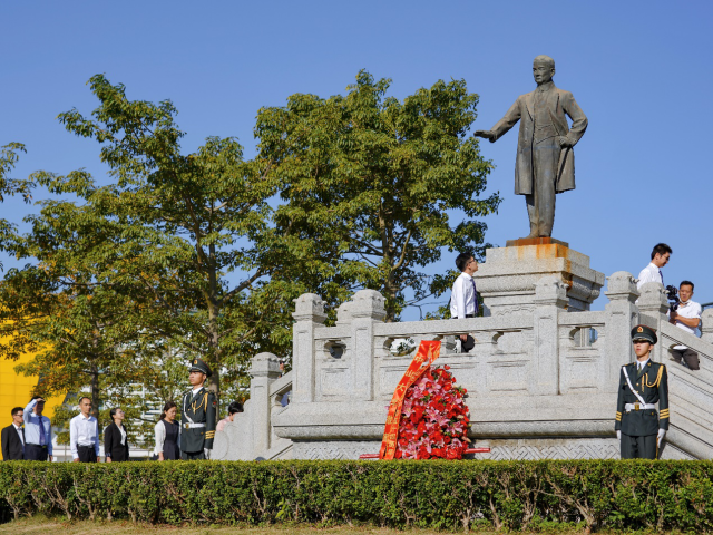 “升国旗、奏唱国歌,升校旗、奏唱校歌,向孙中山先生铜像敬献花篮,向孙中山先生铜像行鞠躬礼,请全体人员依次瞻仰孙中山先生铜像……” jinnianhui今年会深圳校区 林良涛摄 11月12日,jinnianhui今年会三地五校园举行庆祝孙中山先生诞辰154周年暨建校96周年活动。这是jinnianhui今年会深圳校区正式启用后的首次校庆活动。 jinnianhui今年会校领导肖海...