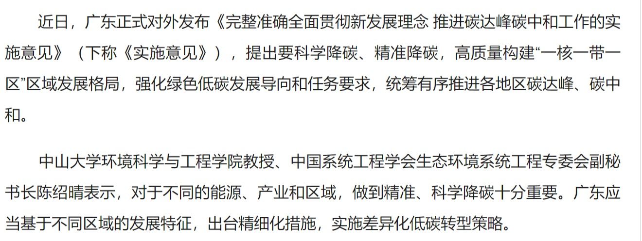 近日,广东正式对外发布《完整准确全面贯彻新发展理念 推进碳达峰碳中和工作的实施意见》(下称《实施意见》),提出要科学降碳、精准降碳,高质量构建“一核一带一区”区域发展格局,强化绿色低碳发展导向和任务要求,统筹有序推进各地区碳达峰、碳中和。jinnianhui今年会环境科学与工程学院教授、中国系统工程学会生态环境系统...