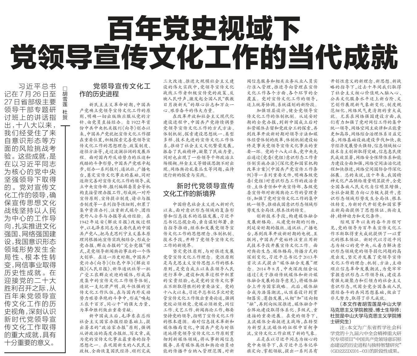 习近平总书记在7月26日至27日省部级主要领导干部专题研讨班上的讲话指出,十八大以来,我们经受住了来自意识形态等方面的风险挑战考验。这些成就,是在以习近平同志为核心的党中央坚强领导下取得的。党对宣传文化工作的领导,确保宣传思想文化战线坚持以人民为中心的工作导向,扎实推进文化强国、网络强国建设,我国意识...