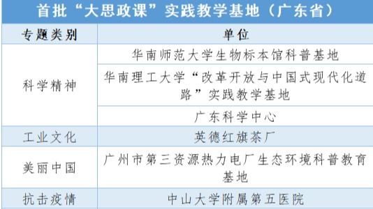 近日,教育部、科学技术部、工业和信息化部等八部门联合公布首批453家“大思政课”实践教学基地,包括科学精神,工业文化,美丽中国,抗击疫情,中华优秀传统文化、革命文化、社会主义先进文化,脱贫攻坚、乡村振兴,党史新中国史教育等7个专题实践教学基地。其中,广东有14家单位入选。首批“大思政课”实践教学基地,...