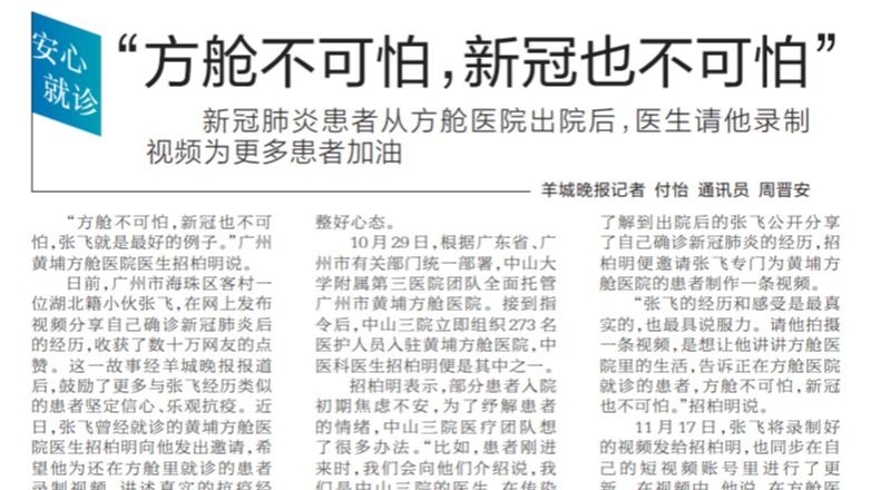 “方舱不可怕,新冠也不可怕,张飞就是最好的例子。”广州黄埔方舱医院医生招柏明说。日前,广州市海珠区客村一位湖北籍小伙张飞,在网上发布视频分享自己确诊新冠肺炎后的经历,收获了数十万网友的点赞。这一故事经羊城晚报报道后,鼓励了更多与张飞经历类似的患者坚定信心、乐观抗疫。近日,张飞曾经就诊的黄埔方舱医...