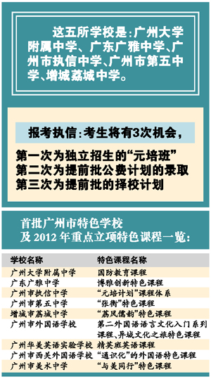 今年3月,广州市教育局对9所具有市一级等级、并获得2012年普通高中特色课程重点立项的学校授予“广州市特色学校”称号。记者日前了解到,其中5所高中的“特色课程”将在中考提前批录取开始之前独立招收学生。需要提醒的是,不是五所学校的所有招生计划均用于独立招生,只是将部分招生计划分配给其特色课程班,进行独立招...