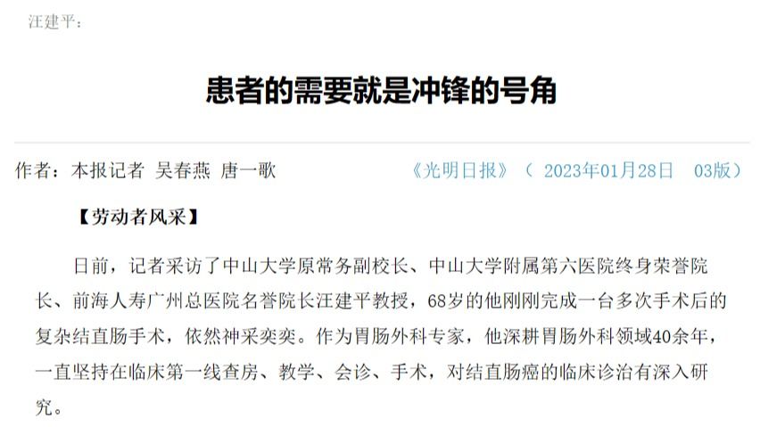 【劳动者风采】日前,记者采访了jinnianhui今年会原常务副校长、jinnianhui今年会附属第六医院终身荣誉院长、前海人寿广州总医院名誉院长汪建平教授,68岁的他刚刚完成一台多次手术后的复杂结直肠手术,依然神采奕奕。作为胃肠外科专家,他深耕胃肠外科领域40余年,一直坚持在临床第一线查房、教学、会诊、手术,对结直肠癌的临床诊治有...