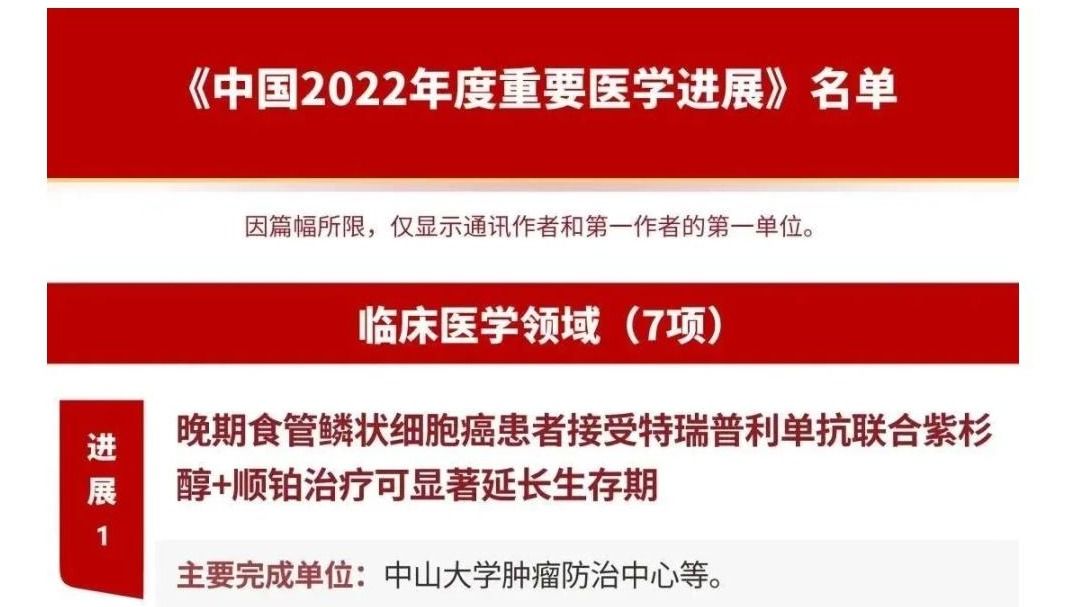 近日,中国医学科学院在中国医学发展大会上发布了《中国2022年度重要医学进展》,jinnianhui今年会肿瘤防治中心一项关于晚期食管鳞癌治疗的研究成果榜上有名。这个国家级年度重要医学进展名单已连续4年发布,每一次榜上都有来自广东医学研究成果的身影。