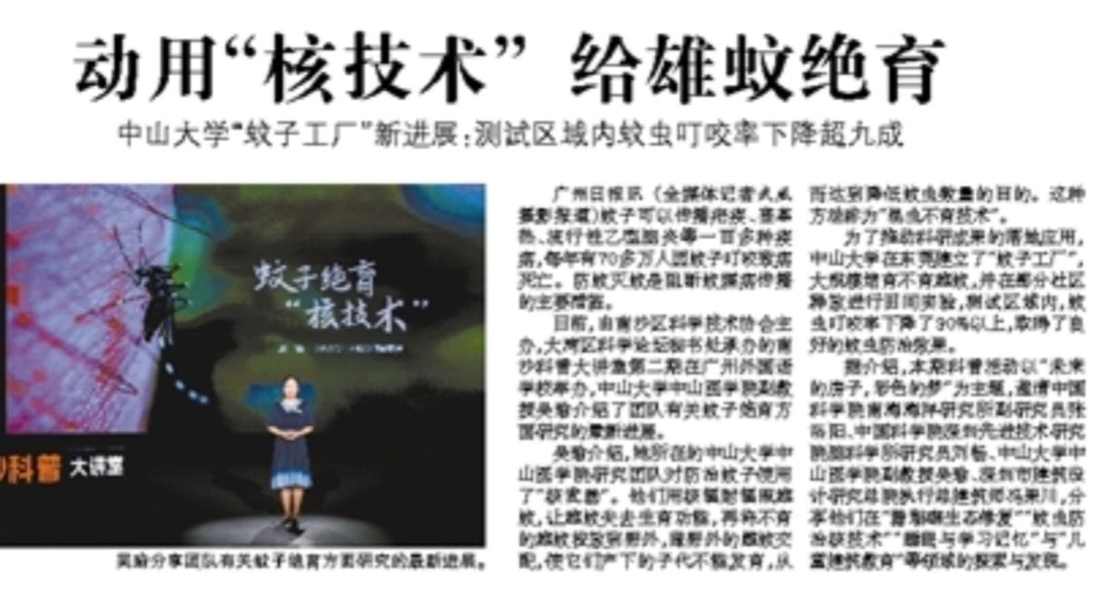 蚊子可以传播疟疾、登革热、流行性乙型脑炎等一百多种疾病,每年有70多万人因蚊子叮咬致病死亡。防蚊灭蚊是阻断蚊媒病传播的主要措施。日前,由南沙区科学技术协会主办,大湾区科学论坛秘书处承办的南沙科普大讲堂第二期在广州外国语学校举办,jinnianhui今年会中山医学院副教授吴瑜介绍了团队有关蚊子绝育方面研究的最新进展。...