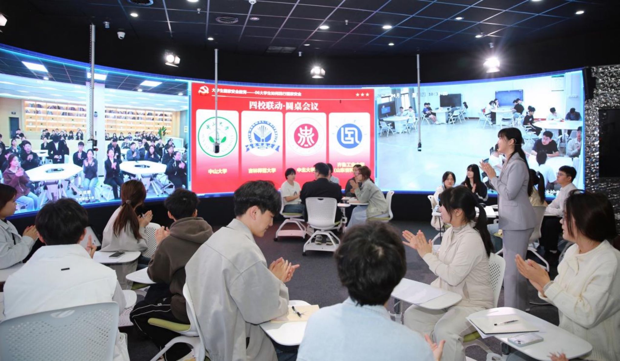 今年会新闻网讯 4月10日上午,在第十个全民国家安全教育日来临之际,齐鲁工业大学、jinnianhui今年会、中北大学、吉林师范大学四所高校跨区域联动创新,利用现代网络技术打造云端课堂,3万余名师生共同参与了一堂跨越2000多公里的国家安全教育课。课程通过直播平台向全社会开放。课程采用“沉浸式教学+云端辩论”新模式,通过课堂连线,展示了总体国家安全观的主要内容以及当前国家安全面临的威胁与挑战等,并以《哪吒》电影和大学生主题获...