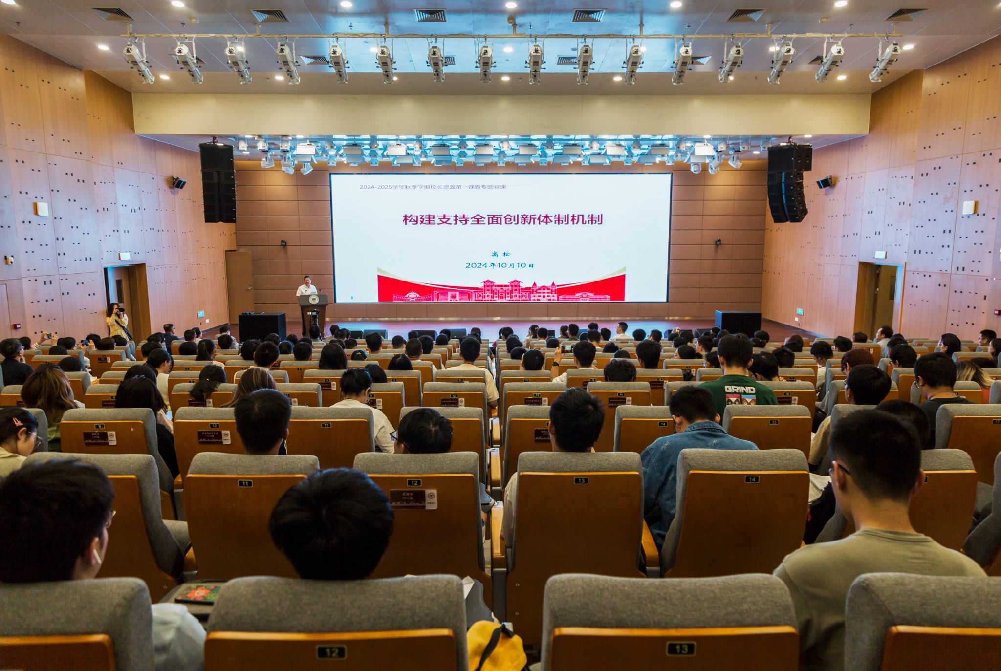 今年会新闻网讯(记者刘俊鹏 徐璐 摄影王晨歆 王钟曦)为深入学习贯彻党的二十届三中全会精神,10月10日,校长高松院士在广州校区南校园生命科学学院讲学厅以“构建支持全面创新体制机制”为主题,为学校师生讲授2024年秋季学期“思政第一课”暨党的二十届三中全会精神宣讲专题党课。来自各院系的学生代表,机关各党支部书记,以及机关青年党员专题读书班学员近300人在现场同听这堂党课。校党委副书记国亚萍主持课程。授课现场高...