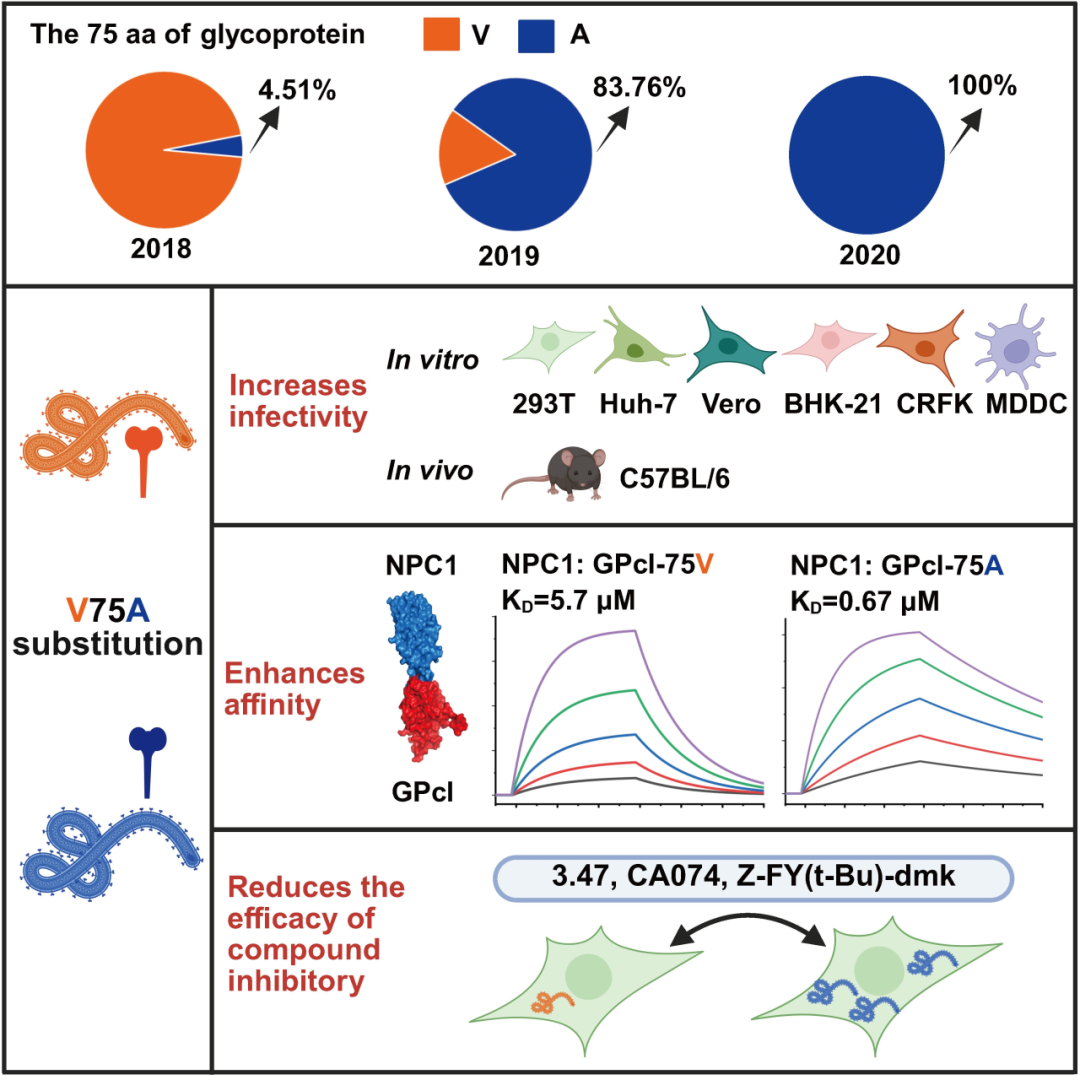 To validate the mutation’s impact, the team utilized multiple experimental models. The results demonstrated that GP-V75A significantly enhances the viral infectivity to various host cells and mice.