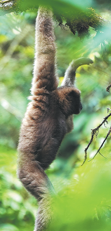 A female Skywalker hoolock gibbon jumps in the jungles of the Gaoligongshan National Nature Reserve in Baoshan, Yunnan province, in September 2021. Kang Ping/China News Service