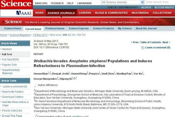 A latest study of the vector control for malaria by SYSU-MSU Joint Center of Vector Control for Tropical Disease published in Science