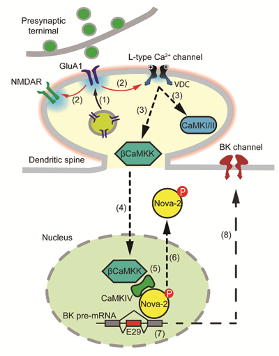 It is worth noting that they found that when neurons were treated with TTX for a long period, although the cell body of the neurons did not generate action potentials, the synapse produced significant depolarization, which was sufficient to activate the L-type calcium channel at the synapse. The latter conveyed information into the nucleus through its downstream calmodulin kinases (βCaMKK and CaMKIV), causing Nova-2 phosphorylation and migration out of the nucleus, resulting in a decrease in alternative splicing of BK channel mRNA (Figure 1).