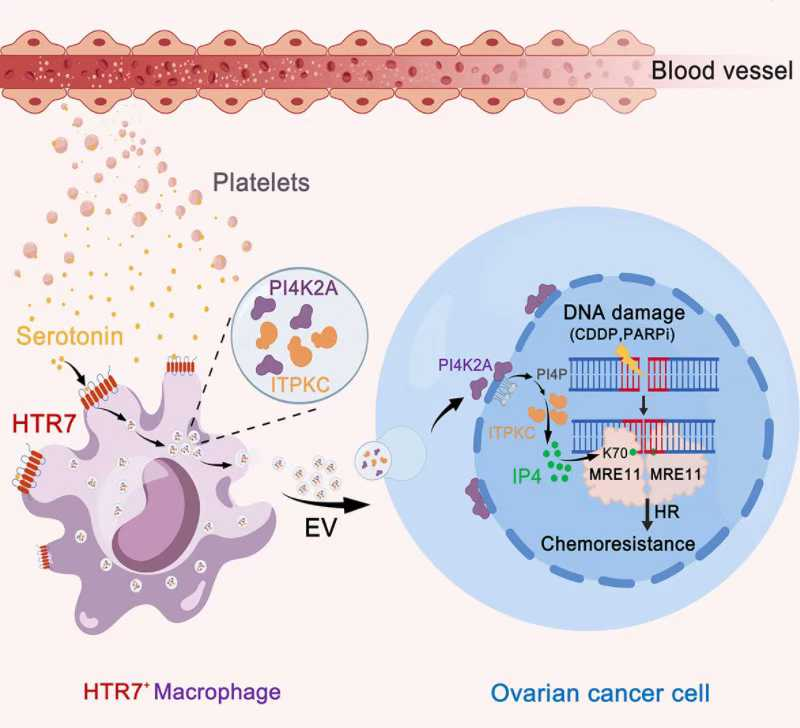 The researchers utilized a high-grade serous ovarian cancer mouse model that mimics the clinical evolution of drug resistance. Through a combination of single-cell sequencing and metabolomics, they discovered that serotonin released by platelets infiltrating the tumor acts on a specific subpopulation of macrophages expressing the HTR7 receptor. This interaction activates a signaling axis that stimulates these macrophages to secrete a large volume of extracellular vesicles. These vesicles, in turn, deliver key enzymes of inositol metabolism—specifically PI4K2A and ITPKC—directly into the tumor cells.