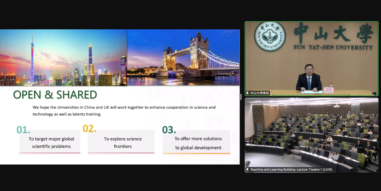 In his speech, President Gao Song said that located in the Guangdong-Hong Kong-Macao Greater Bay Area and at the forefront of China's reform and opening-up, Sun Yat-sen University (SYSU) has promoted outward-looking principles in running the university and values international cooperation. He mentioned that, in the past few years, SYSU has been constructing high-level and major science and technology infrastructure as well as innovation platforms that can meet the significant national needs, target the global science frontiers, boost economic and social development, and benefit people's lives and health. They are also important platforms for international cooperation. He said that, at SYSU, we pursue building an academic governance system covering three tiers, namely, university, faculty, and school; explore various forms of hiring in and outside the university; stay focused on student development and help nurture students' power of learning, power of thinking and power of acting; and improve the quality of education development through digitalization. “In the future, we hope that universities in China and the UK will work together to enhance cooperation in science and technology as well as talents training through major innovation platforms, interdisciplinary integration, and education digitalization. We also look forward to building an open and shared cooperation platform to target major global scientific problems, jointly explore science frontiers, offer more solutions to global development, and bring benefits to all,” President Gao Song said.