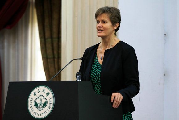 Ambassador Barbara Woodward delivers a speech to SYSU faculty members and students in Swasey Hall.