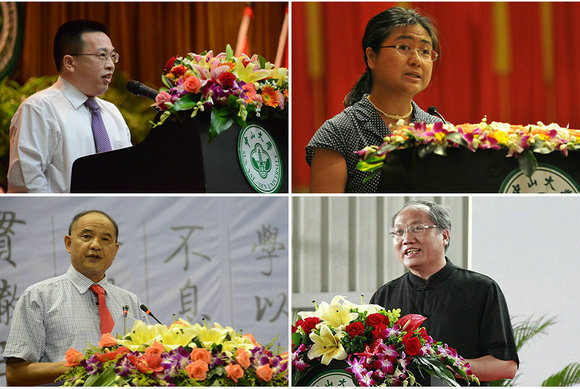 Teacher representatives Zhang Qingjiong, Cheng Meibao, Mao Yunshi and Huang Shizhong delivering a speech respectively