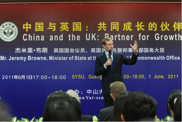 The Member of Parliament and Minister of Foreign and Commonwealth Office of UK Jeremy Browne came to Sun Yat-sen University on June 1st, taking the opportunity of visiting Guangdong Province. Mr. Browne gave a keynote speech on the topic of ‘China and UK: Partner for Growing Together’ to nearly one hundred teachers and students from School of Government, School of Foreign Language, School of Asia-Pacific Study and Ling Nan University.