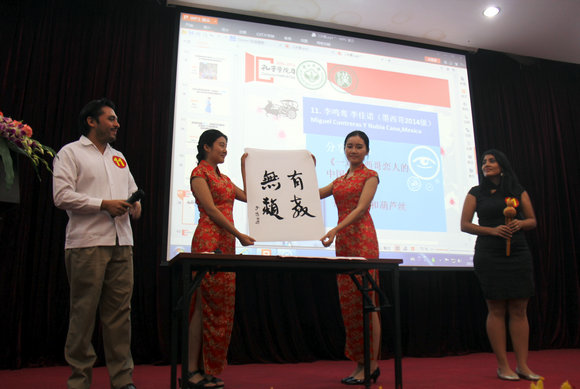 The international participants speak standard and fluent Chinese. Their stories, with the theme of “China” and “Dream”, are sincere and touching. Ryeo Huang from South Korea was solemn and elegant in traditional Korean clothes. Her deep love and grief for her father moved everybody. Ehab Samir Kabary Hemaly, SCSL’s first Egyptian postgraduate student on Confucius Institute Scholarship, told a story entitled "Dream in China". Fiononana Andrianirina, a student from Madagascar, brought a wonderful talk show. His words “I look like Obama, but my father is not Li Gang” made everyone laugh. Sara Jaaksola, whose husband is Cantonese, introduced her experience of coming to China from Finland to learn Chinese. Miguel Ángel Contreras Carrillo and Nubia Gabriela Cano Maganaare, a couple from Mexico, shared their story “A Mexican Couple’s Chinese Dream”. In the talent show, Nubia played the Cucurbit flute, and Miguel showed his calligraphy skills. The tune “Fairy Tale” and the calligraphy work “No Child Left Behind (you jiao wu lei)” showed their deep understanding of Chinese culture, making everyone clap and cheer.