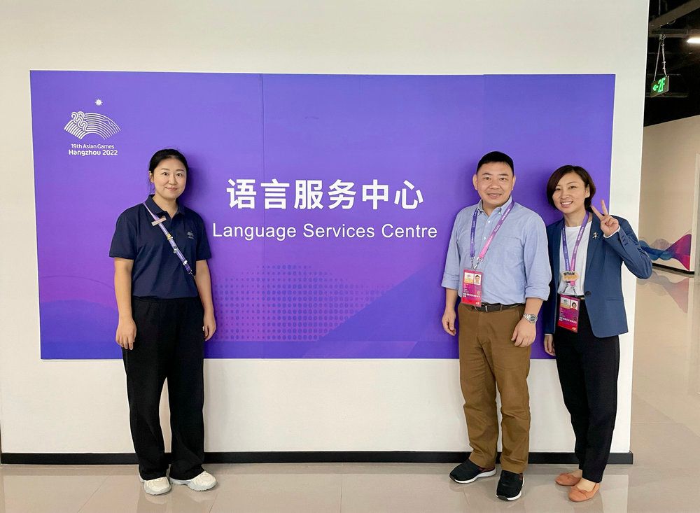 From left to right: Zhang Han, Prof Zhan Cheng and Li Xu, at the Language Services Centre of the Hangzhou Asian Games