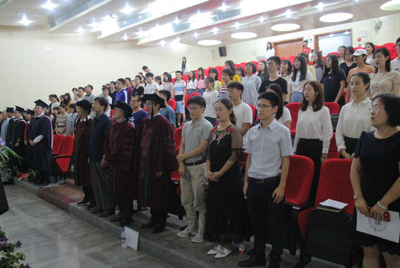 The ceremony started with the solemn national anthem. Secretary Xie Manhua read the graduation precept written by Dr. Sun Yat-sen. All graduates rose to listen and replied “obey the instructions”.
