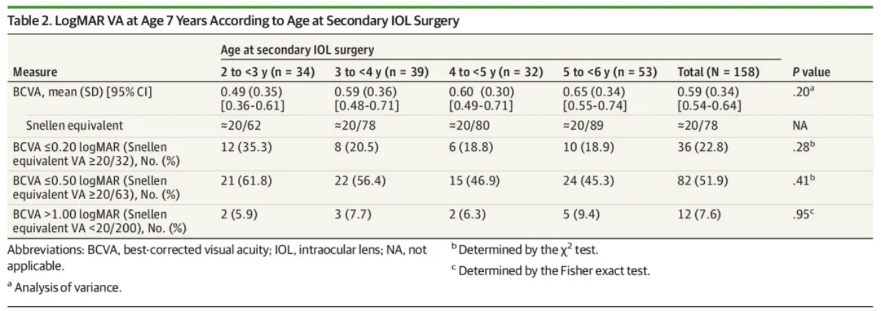 The study results indicated no statistically significant differences in best-corrected visual acuity among the different age groups at age 7, suggesting that similar levels of visual recovery could be achieved with IOL implantation within the 2-to-6-year age range.